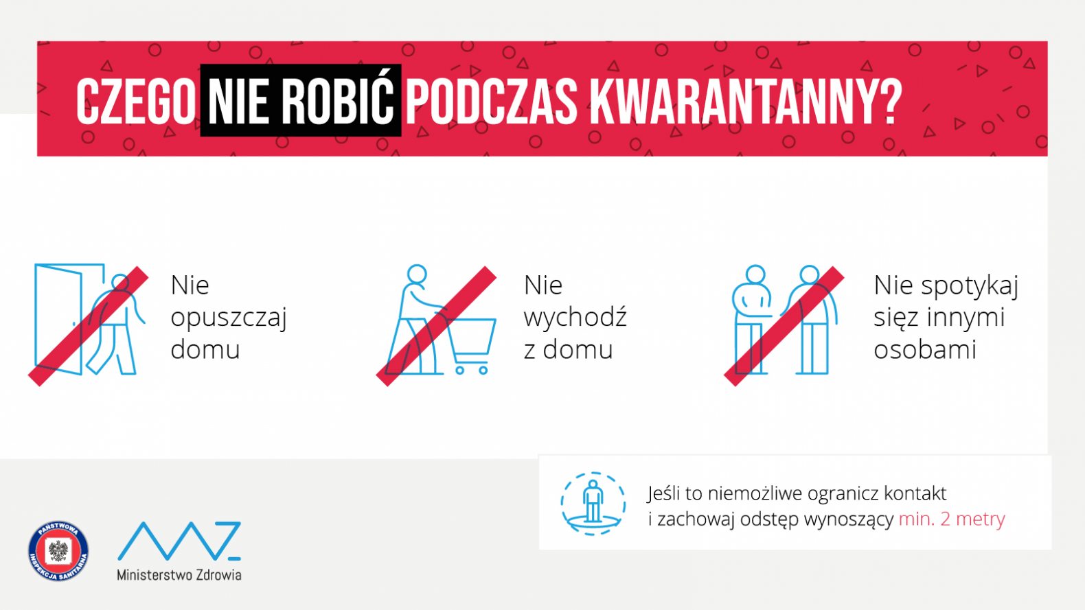 Ponadto w czasie kwarantanny należy przestrzegać zasad higieny, w szczególności myć ręce; unikać dotykania oczu i ust, zakrywać usta i nos podczas kaszlu zgięciem łokcia lub chusteczką.