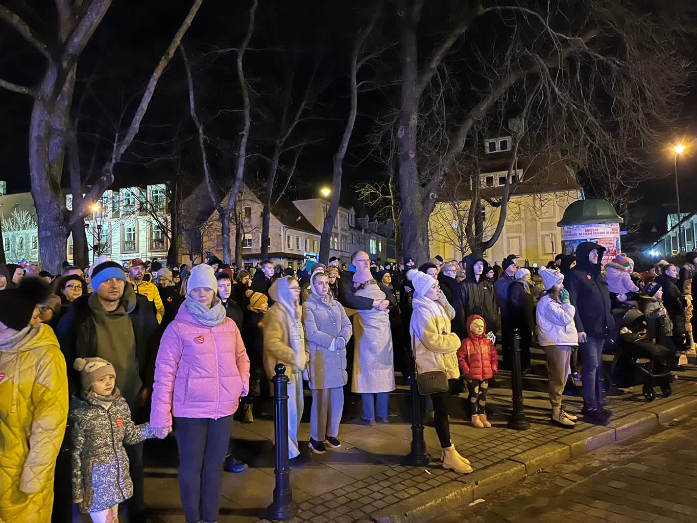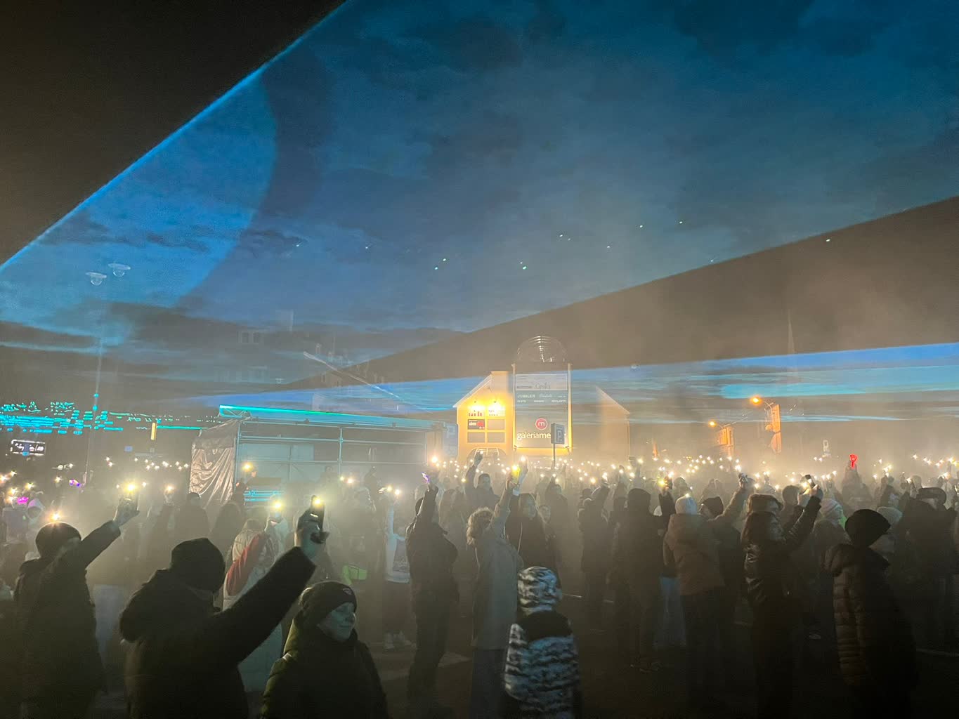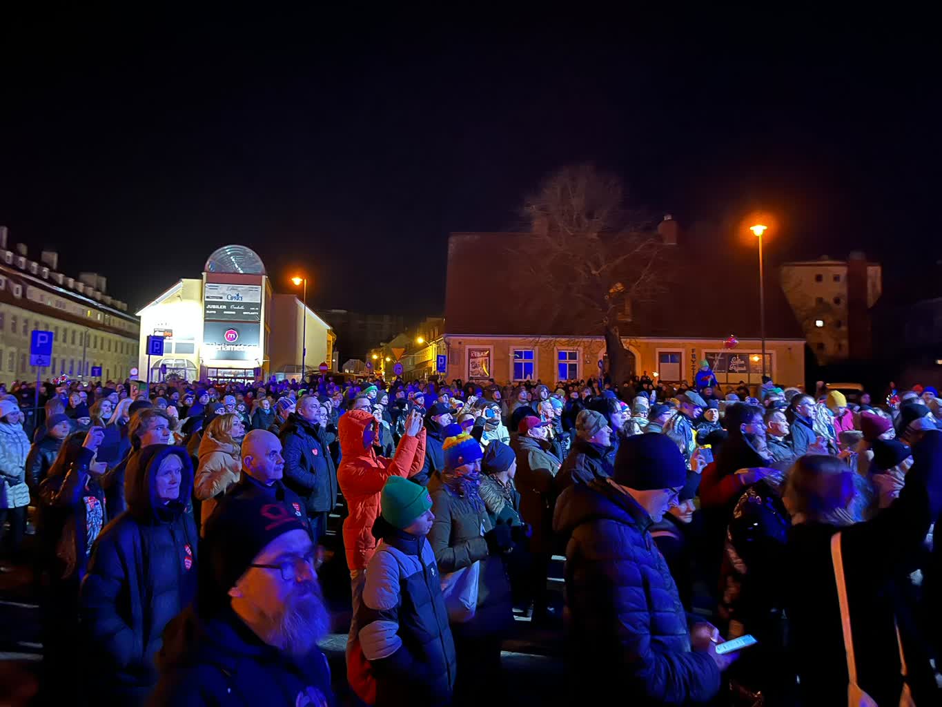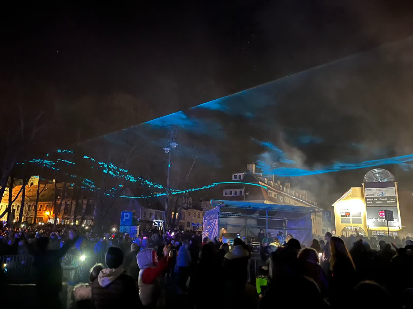 W tym roku, zamiast tradycyjnych fajerwerków, zielonogórzanie mogli uczestniczyć w pokazie laserów, który odbył się na placu przed filharmonią.