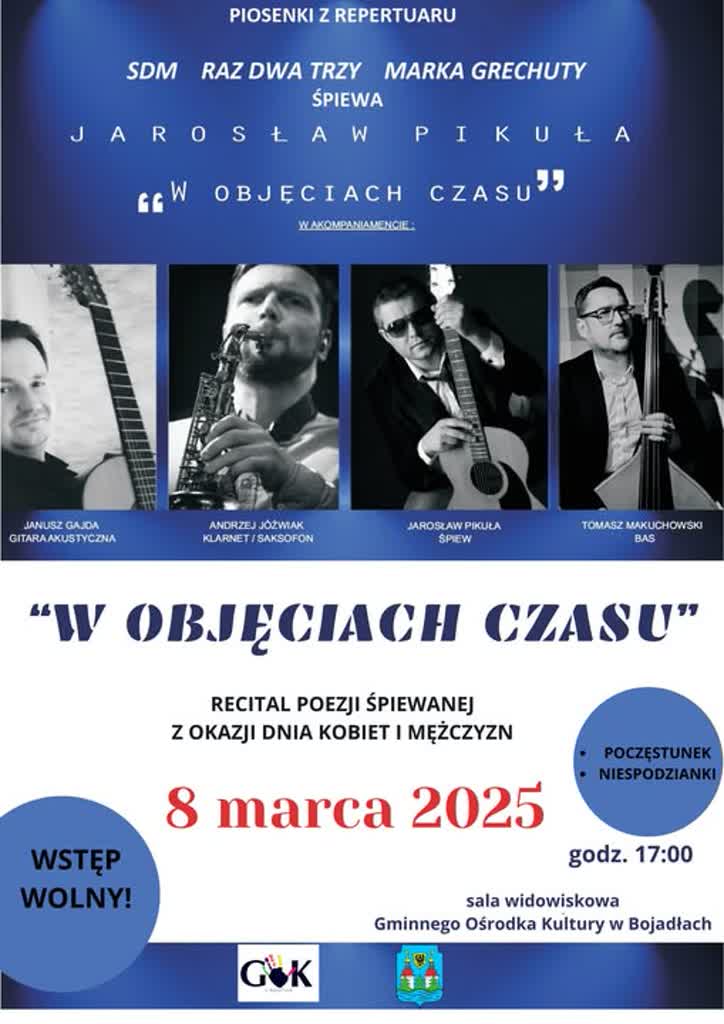 Na koncert muzyczny „W objęciach czasu” zaprasza mieszkańców obu płci Gminny Ośrodek Kultury w Bojadłach. Powodem jest oczywiście sobotnie Święto Kobiet i przypadające dwa później Święto Mężczyzn. – To będzie wydarzenie, w którym warto wziąć udział – zachęca Aleksandra Schubert, dyrektor placówki.