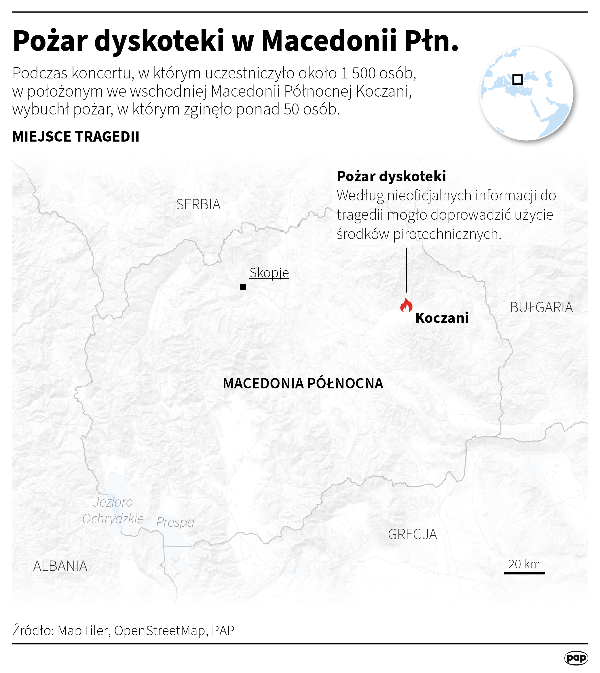 Do pożaru w klubie w miejscowości Koczani na wschodzie Macedonii Północnej doszło ok. 3 nocy w trakcie koncertu macedońskiego zespołu hip-hopowego. Na publikowanych w mediach społecznościowych nagraniach widać pojawiające się trakcie występu płomienie. Gdy ogień ogarnął sufit, wybuchła panika, w wyniku której wiele osób zostało rannych. Do tragedii doprowadziło najprawdopodobniej nieodpowiednie użycie środków pirotechnicznych – podały macedońskie media. Śledztwo w sprawie ustalenia okoliczności wypadku trwa.