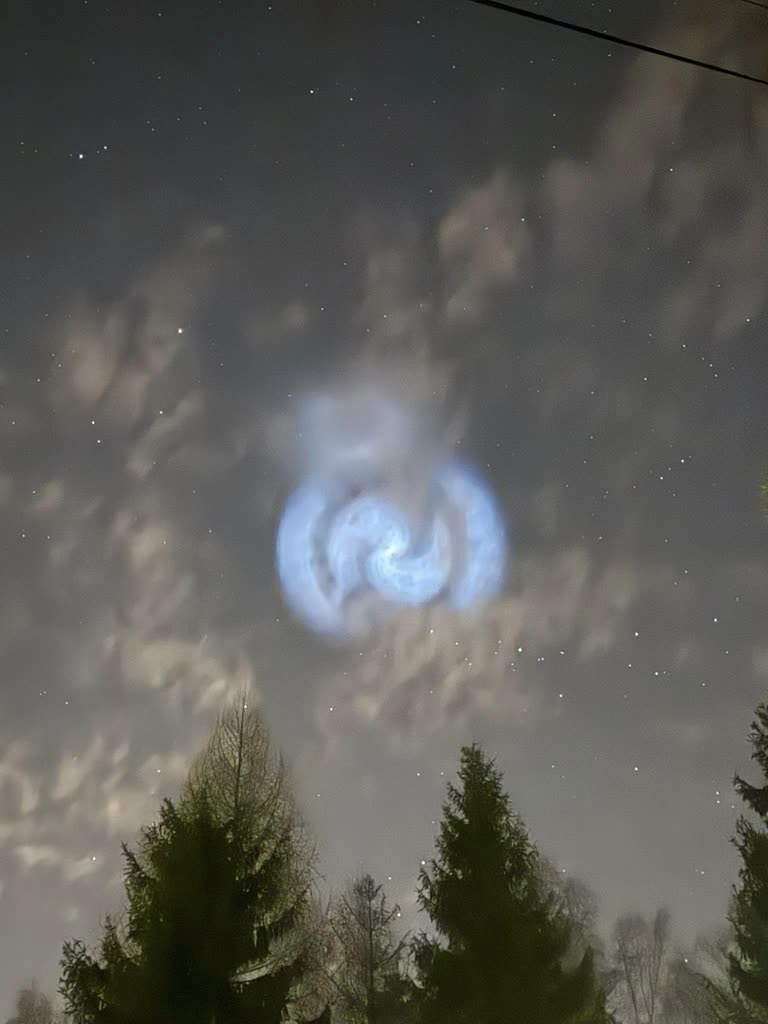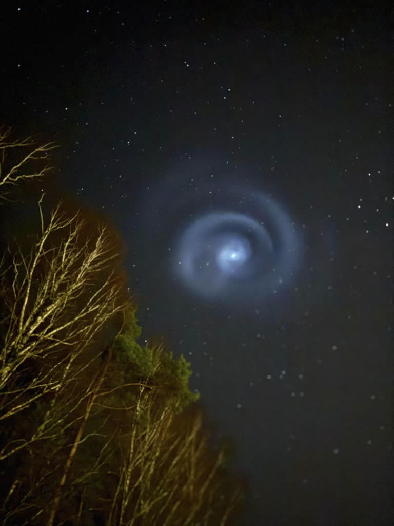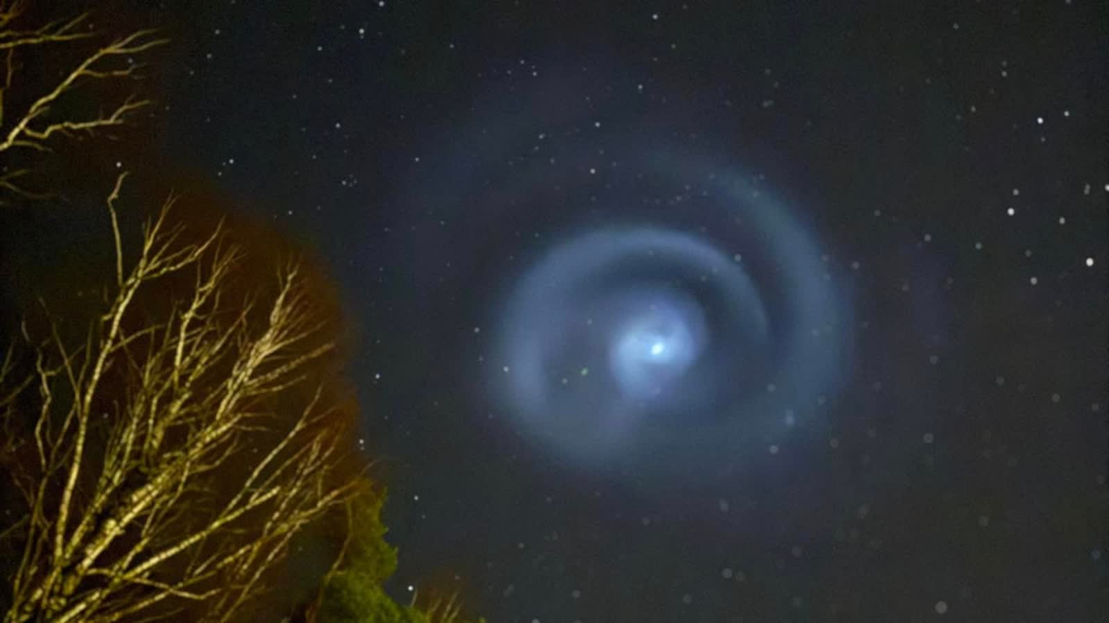 Wyjaśnił, że podczas planowanej deorbitacji, zanim drugi stopień rakiety wejdzie w atmosferę i spłonie, często dochodzi do zrzutu resztek paliwa. Dzieje się to już w przestrzeni kosmicznej – kilkaset kilometrów nad Ziemią – gdzie nie ma powietrza, więc wyrzucone gazy nie rozpraszają się chaotycznie, lecz tworzą symetryczne struktury. Wskazał również, że jeśli rakieta obraca się wokół własnej osi (co jest często celowe, by ustabilizować lot), wypuszczane z dysz paliwo układa się w kształt spirali lub wiru, przypominający świetlistą galaktykę.