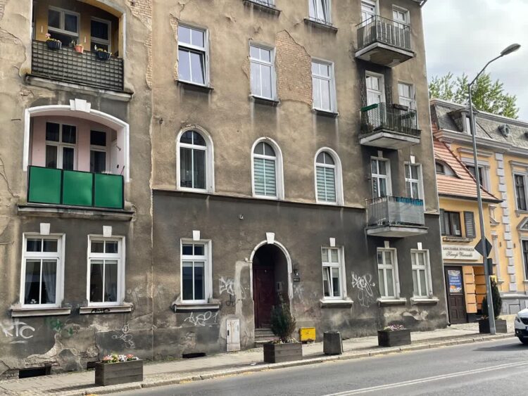 Pękający tynk, odsłonięte cegły, bazgroły na murze – fasada kamienicy przy ul. Łokietka 36 jest w złym stanie. Budynek znajduje się na wjeździe do centrum miasta, przy ruchliwej ulicy, w pobliżu szkoły.