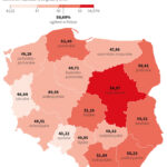 Przewodniczący Państwowej Komisji Wyborczej Sylwester Marciniak poinformował, że najwięcej kart do głosowania wydano w województwach mazowieckim – 55 proc., małopolskim – 52,9 proc. i pomorskim – 52,4 proc. Najniższa frekwencja była w województwach opolskim (43,2 proc.), lubuskim (46,8 proc.) i warmińsko-mazurskim (47,9 proc.).