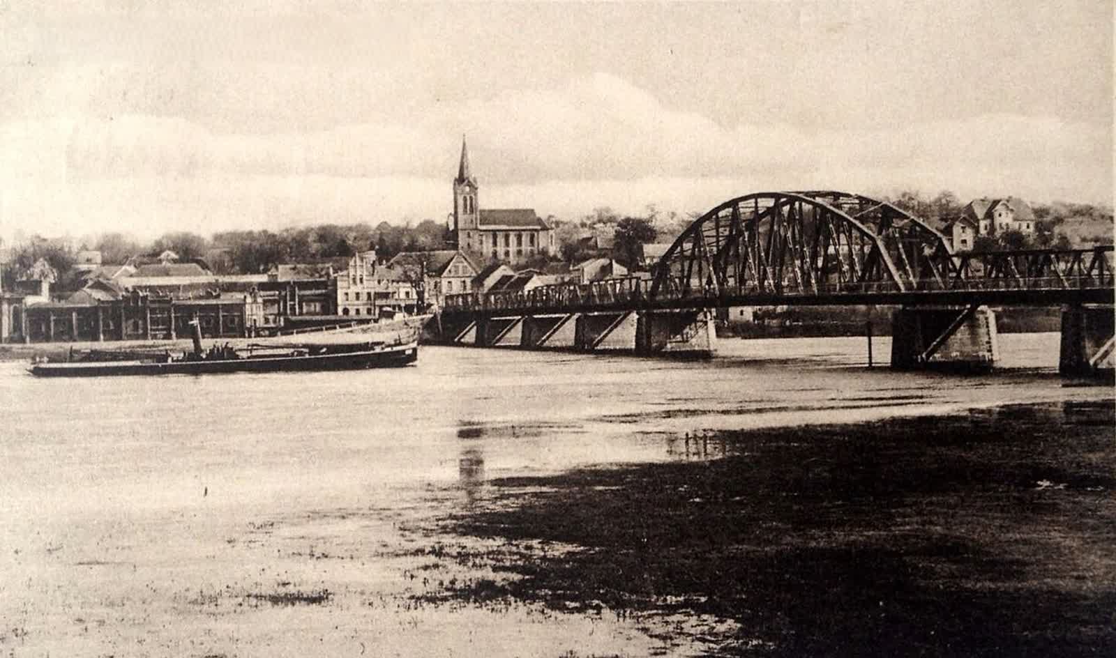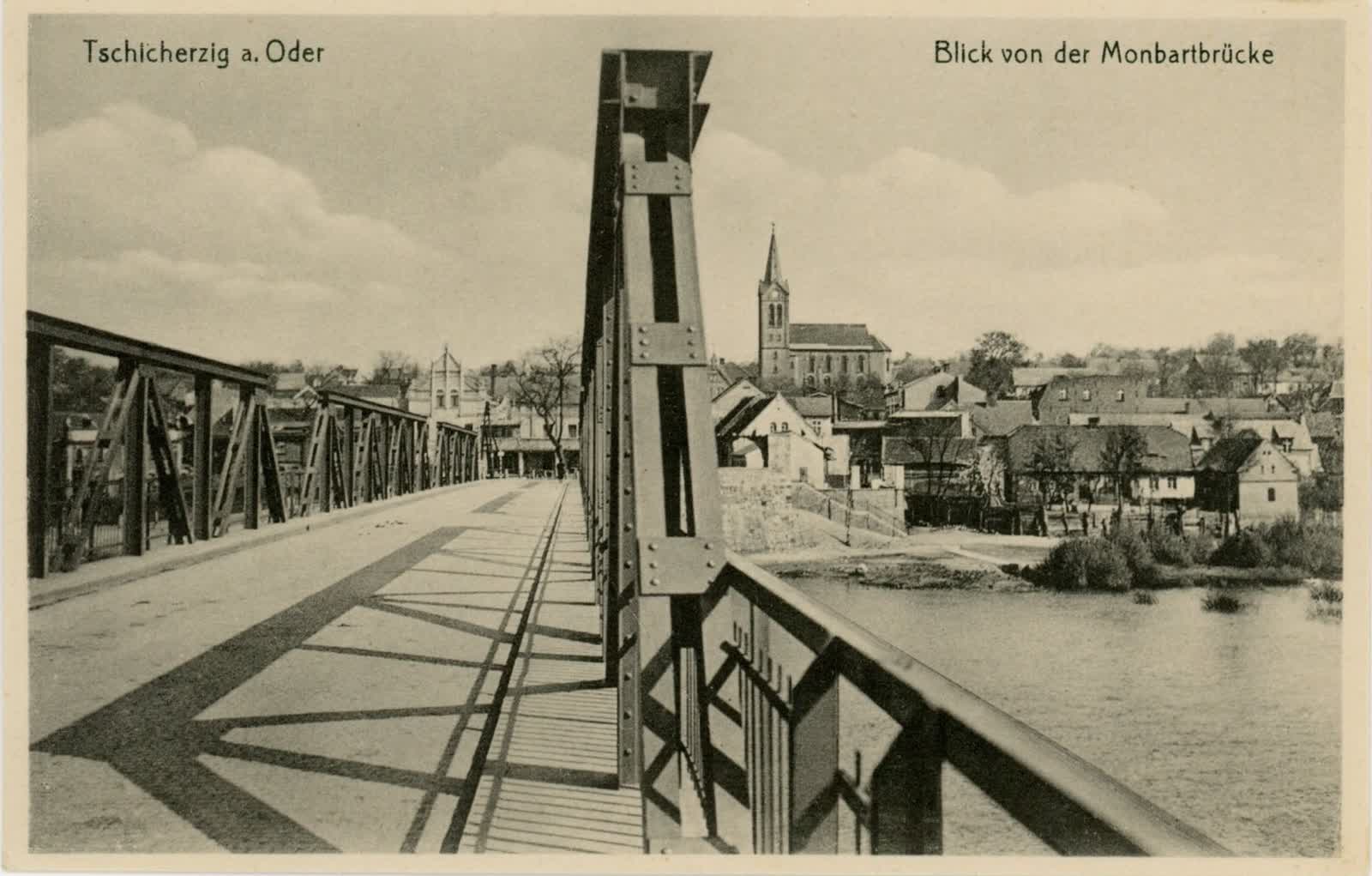 Jest dziełem przedwojennej niemieckiej myśli technicznej i został wyprodukowany zakładach Beuchetla w dawnym Grunbergu.  Obiekt otwarto 29 kwietnia 1925 pod nazwą Monbart. 29 stycznia 1945 piąte przęsło mostu zostało wysadzone przez niemieckich saperów. W lutym 1945 Rosjanie wybudowali most pontonowy, na którym dokonali skutecznej przeprawy taktycznej zdobywając przyczółek. W latach 50. pod nadzorem fachowców z zielonogórskiego Zastalu odbudowano wysadzone przęsło, a nowe elementy stalowe dostarczyła Huta „Kościuszko”.
