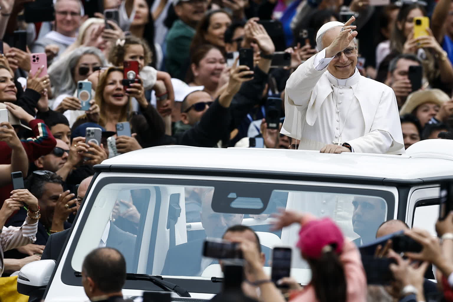 Leon XIV objechał plac w papamobile pozdrawiając entuzjastycznie witających go wiernych.