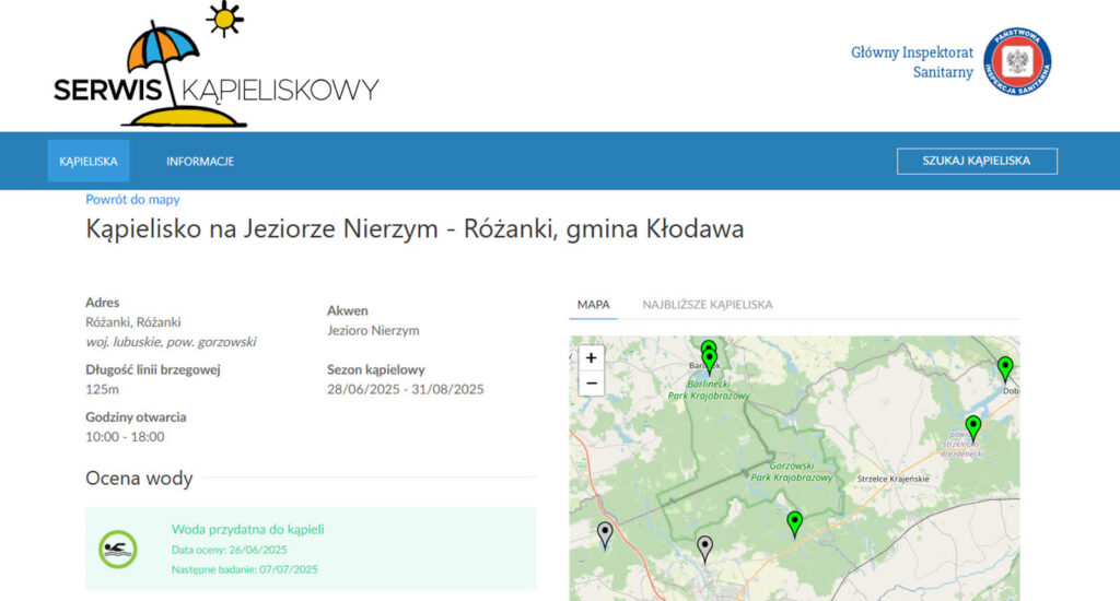 Główny Inspektorat Sanitarny regularnie kontroluje czystość wody na kąpieliskach i udostępnia wynik badań w internetowym serwisie kąpieliskowym. Dzięki temu możemy łatwo sprawdzić, czy wybrane kąpielisko jest bezpieczne , a czystość wody spełnia wymagane normy. Mówi Aneta Mokosa, rzeczniczka prasowa lokalnego sanepidu w Gorzowie: