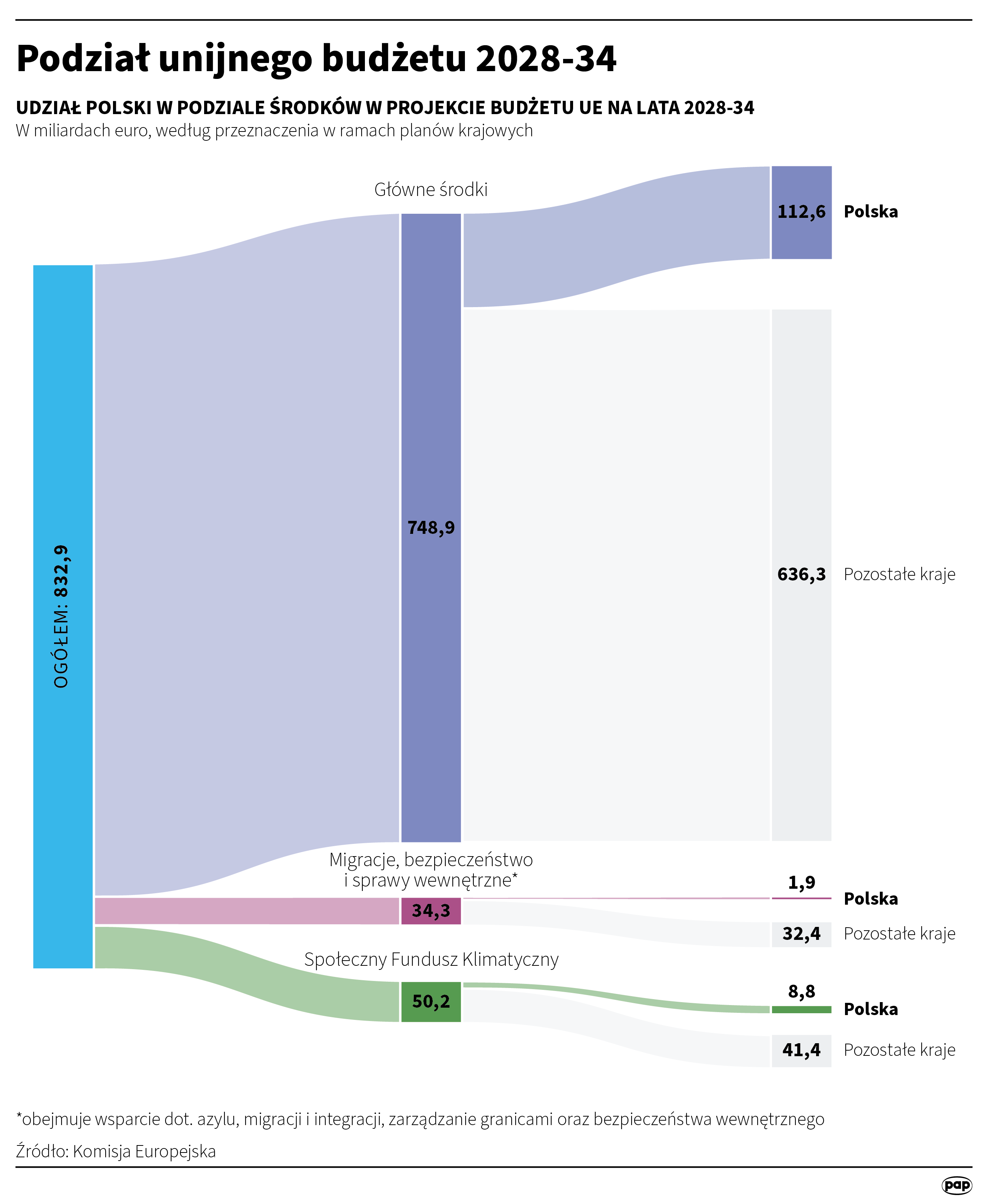 Polska, jak wynika z zestawienia KE, ma największą kopertę. Na drugim miejscu znalazły się Francja (około 90 mld euro) i Hiszpania (około 88 mld euro).