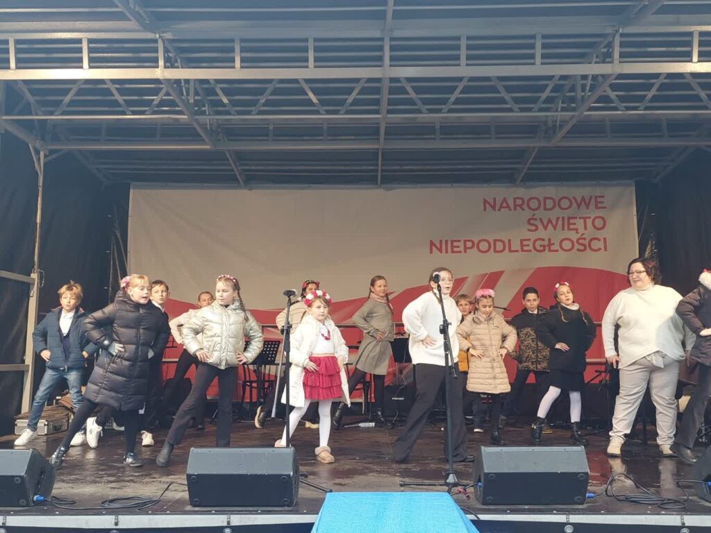 Na scenie prezentują się najmłodsi artyści z Zielonogórskiego Ośrodka Kultury. Na miejscu zgromadziło się kilkudziesięciu mieszkańców, którzy podkreślali, że pieśni patriotyczne są ważnym elementem każdych uroczystości: