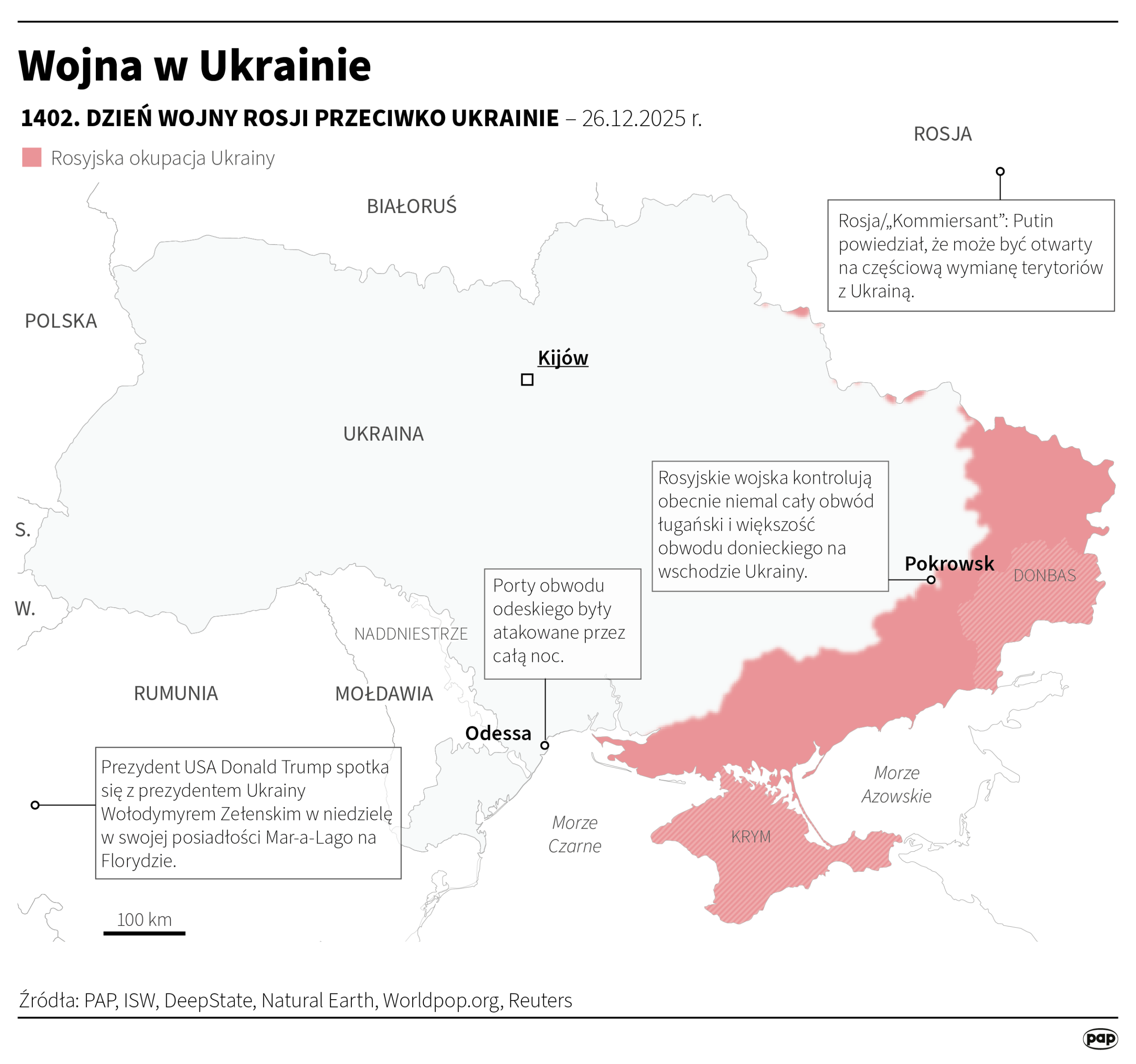 Jak podała gazeta, Putin na spotkaniu 24 grudnia miał zapewnić, że strona rosyjska jest nadal gotowa na ustępstwa, jakie zaproponował w sierpniu w rozmowach z prezydentem USA Donaldem Trumpem w Anchorage na Alasce. Jednocześnie miał podkreślić, że Donbas należy do Rosji, a „kwestia Kramatorska, Konstantynówki, Słowiańska nie podlega dyskusji”.