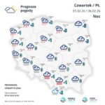 Alert obowiązywać będzie w nocy z czwartku (5 lutego) na piątek (6 lutego) i w piątek na terenie województw: zachodniopomorskiego, pomorskiego, kujawsko-pomorskiego, wielkopolskiego (powiat złotowski), łódzkiego (powiaty kutnowski, łowicki, skierniewicki, Skierniewice, rawski), mazowieckiego (powiaty białobrzeski, gostyniński, grodziski, grójecki, kozienicki, lipski, Radom, radomski, sochaczewski, zwoleński, żyrardowski, ciechanowski, garwoliński, legionowski, łosicki, makowski, miński, mławski, nowodworski, ostrołęcki, Ostrołęka, ostrowski, otwocki, piaseczyński, Płock, płocki, płoński, pruszkowski, przasnyski, pułtuski, Siedlce, siedlecki, sierpecki, sokołowski, Warszawa, warszawski zachodni, węgrowski, wołomiński, wyszkowski, żuromiński), podlaskiego (powiaty bielski, hajnowski, siemiatycki, wysokomazowiecki, zambrowski), lubelskiego (powiaty Chełm, chełmski, krasnostawski, kraśnicki, lubelski, Lublin, łęczyński, opolski, puławski, świdnicki, bialski, Biała Podlaska, lubartowski, łukowski, parczewski, radzyński, rycki, włodawski) i warmińsko-mazurskiego (powiaty: braniewski, działdowski, Elbląg, elbląski, iławski, lidzbarski, nidzicki, nowomiejski, Olsztyn, olsztyński, ostródzki, szczycieński).