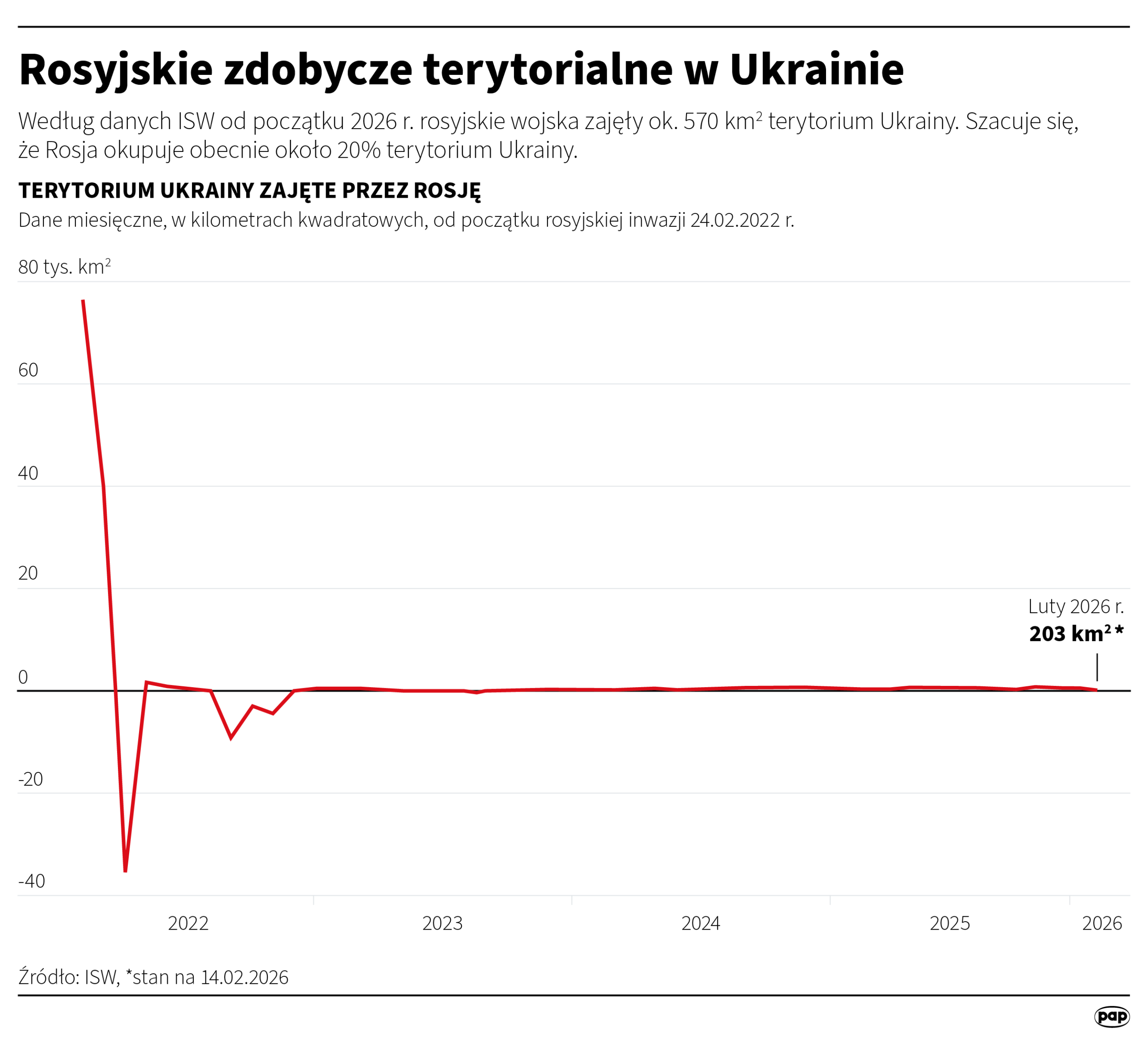 Średnie tempo rosyjskich postępów wzrosło do ok. 13 kilometrów kwadratowych dziennie wobec niespełna 10 kilometrów kwadratowych w 2024 r. W 2025 r. Rosja zajęła około 4600 kilometrów kwadratowych terytorium Ukrainy, przy około 3500 kilometrów kwadratowych rok wcześniej.