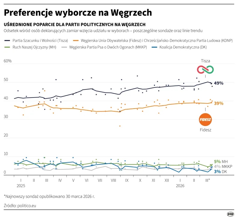 Opozycyjna TISZA pod przewodnictwem Petera Magyara wyprzedza Fidesz premiera Viktora Orbana w większości niezależnych sondaży. W ostatnich tygodniach wykazywały one poparcie dla Tiszy na poziomie od 49 do 58 proc. wśród zdecydowanych wyborców, przy poparciu dla Fideszu wahającym się między 35 a 38 proc. W większości badań jedyną inną partią, która może wejść do parlamentu, jest skrajnie prawicowa Mi Hazank (Ruch Naszej Ojczyzny).