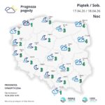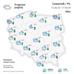 Nocą z czwartku na piątek zachmurzenie duże z większymi przejaśnieniami, a na północy i zachodzie Polski także z rozpogodzeniami. Na wschodzie kraju możliwe są przelotne opady deszczu. W drugiej połowie nocy na wybrzeżu mogą występować mgły ograniczające widzialność do 200 m. Lokalnie widzialność może spadać nawet poniżej 200 m.