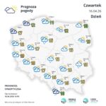 W czwartek (16 kwietnia) zachmurzenie duże z większymi przejaśnieniami. Miejscami będą pojawiać się rozpogodzenia, głównie w centrum i na północnym wschodzie Polski. Na południowym wschodzie i południu lokalnie mogą występować przelotne opady deszczu. Temperatura maksymalna na przeważającym obszarze kraju wyniesie ok. 16 st. C. Cieplej będzie na zachodzie, gdzie termometry pokażą ok. 20 st. C. Chłodniej na północnym wschodzie, ok. 10 st. C. Na wybrzeżu między 7 a 9 st. C. Wiatr słaby i okresami umiarkowany, zmienny, przechodzący w północno-zachodni.