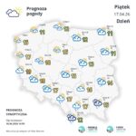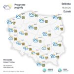 W piątek na zachodzie Polski zachmurzenie małe i umiarkowane. Na pozostałym obszarze kraju zachmurzenie duże z większymi przejaśnieniami oraz przelotne opady deszczu. Więcej deszczu spadnie na południu, do ok. 7-8 mm. Rano nad morzem lokalnie nadal mogą utrzymywać się mgły ograniczające widzialność do 200 m, ale w ciągu dnia będą one szybko zanikać. Tempera maksymalna od 7 st. C nad morzem, przez ok. 15 st. C na przeważającym obszarze kraju, do 20 st. C na południowym zachodzie, przede wszystkim w woj. dolnośląskim i lubuskim. Wiatr będzie słaby i umiarkowany, na wschodzie i południu okresami porywisty, północno-zachodni i północny.