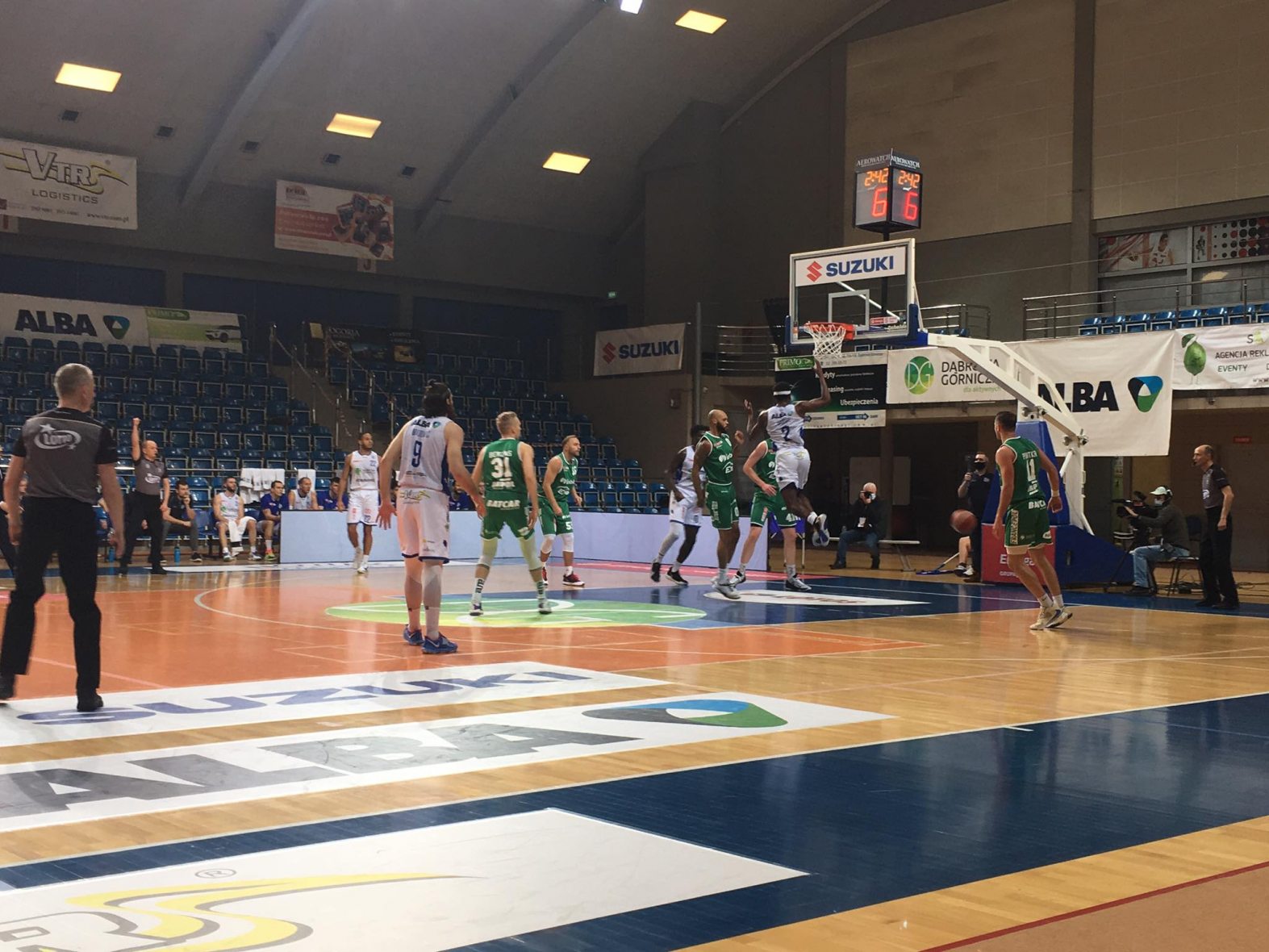 Zaczął się mecz od dwóch trójek Moore’a i prowadzenia miejscowych 6-0. Dąbrowianie prowadzili do 5 minuty – wtedy w końcu Zastal wyszedł na prowadzenie 16-15. I Zastalowcy zaczęli cisnąć coraz bardziej – sporo grał Filip Put, który szybko zdobył 5 punktów, dobrze poczynał sobie pod koszem Geofrey Groselle(9 pkt.), a Zastal po I kwarcie prowadził 28-20.