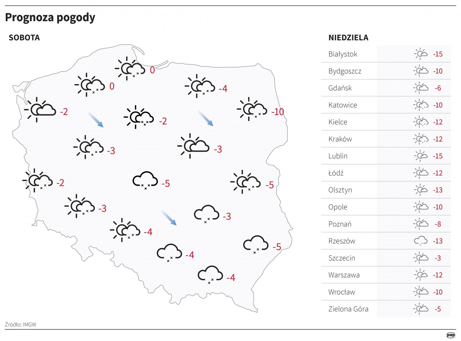 „Ten chłód utrzyma się jeszcze w poniedziałek. Noc z niedzieli na poniedziałek nadal z temperaturami do -22 st. Temperatura w centrum kraju może spaść do -16 st.” – przekazał Walijewski. W dzień nieco cieplej, ale – jak zaznacza IMGW – temperatury ujemne w dalszym ciągu będą osiągały wartości dwucyfrowe.