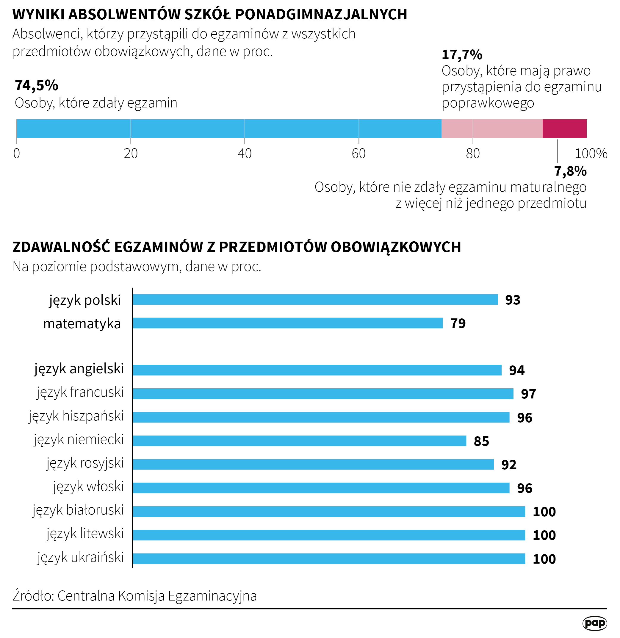 Egzamin maturalny z języka polskiego zdało 93 proc. tegorocznych absolwentów szkół ponadgimnazjalnych, egzamin z matematyki zdało 79 proc. absolwentów, a egzamin z języka angielskiego, najczęściej wybieranego na maturze, zdało 94 proc. (PAP)