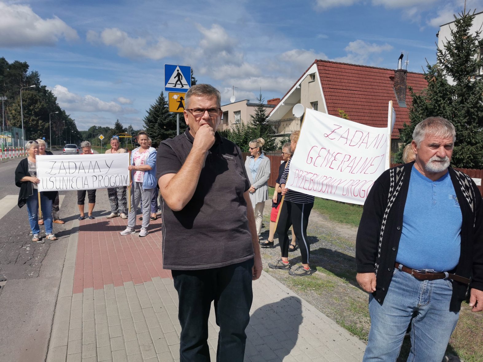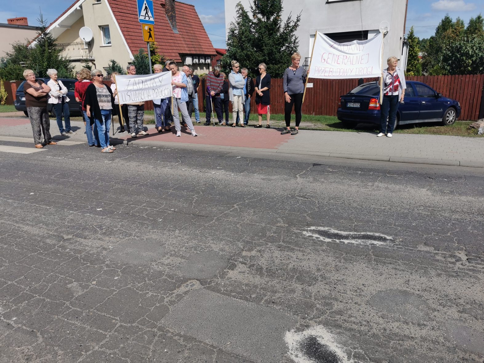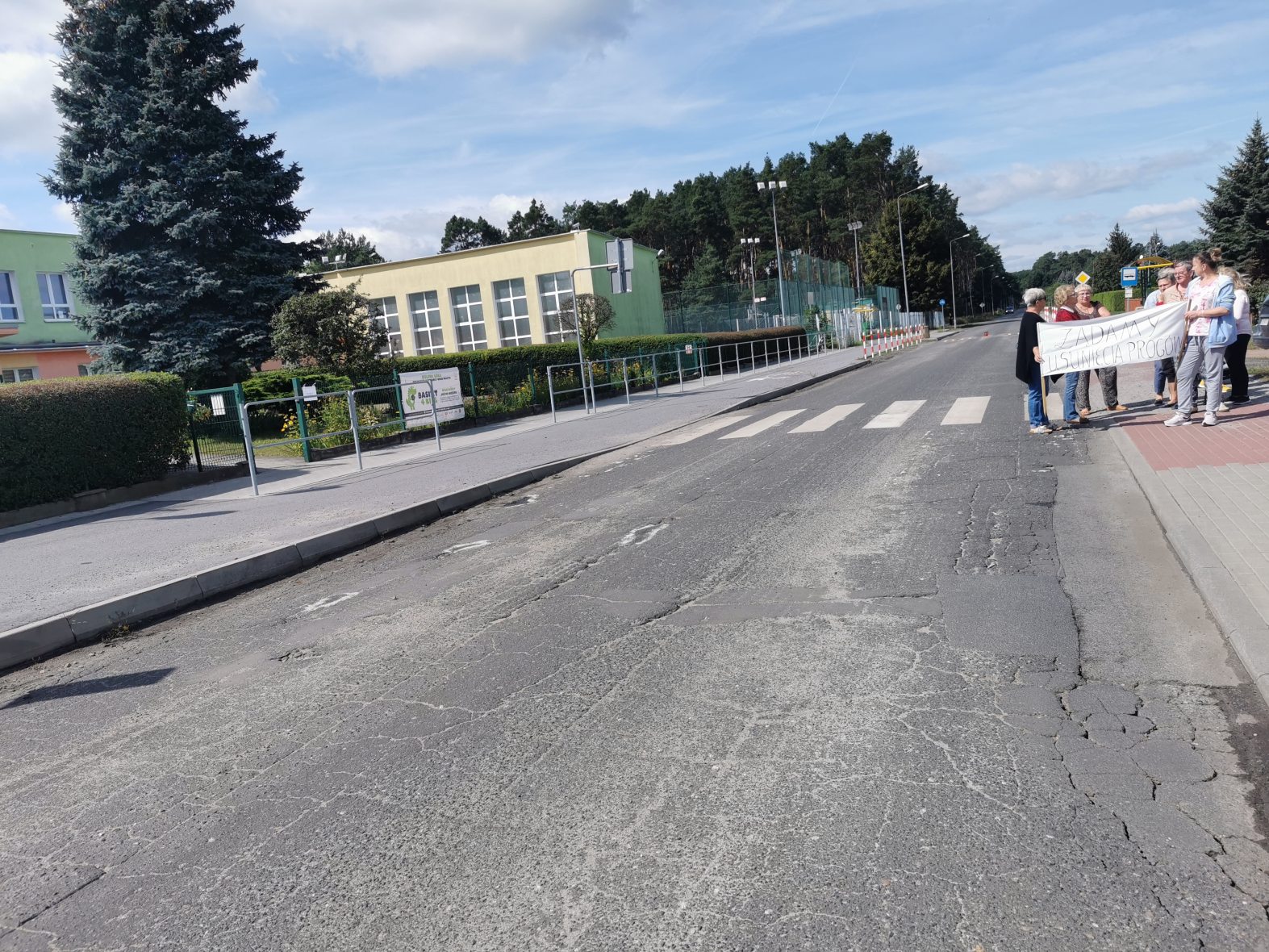 Chodzi o zły stan tej drogi oraz o wpływ progów zwalniających na pobliskie domy. Zdaniem mieszkańców wibracje spowodowane najeżdżaniem na progi powodują uszkodzenia ich domów. Od 12:30 kilkunastu zielonogórzan blokowało ul. Szkolną przechodząc z transparentami przez przejście dla pieszych.