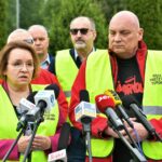 ⬆ Przewodniczący Krajowego Sekretariatu Górnictwa i Energetyki NSZZ „Solidarność” Jarosław Grzesik (drugi od prawej) oraz europosłanka PiS Anna Zalewska podczas konferencji prasowej ws. stanowiska do wyroku TSUE nakazującego wstrzymanie wydobycia w Kopalni Węgla Brunatnego Turów. Fot. PAP/Maciej Kulczyński