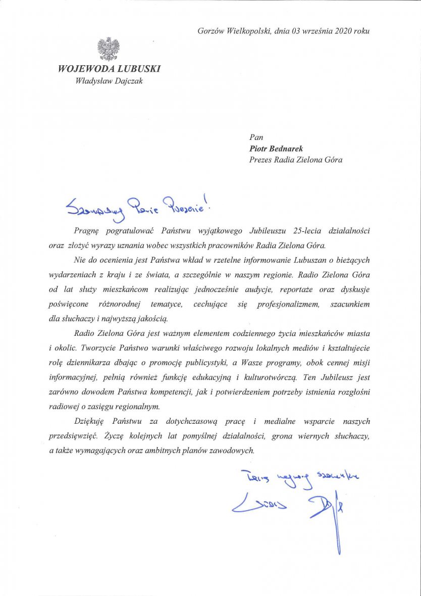 Przypomnijmy, finał naszych 25-tych urodzin w sobotę o 12:00 na 97’1 fm. A w poniedziałek pokaz świetlny „RZG Light Show”, do obejrzenia od 20:00 na Winnym Wzgórzu przy Palmiarni. Pełna treść listu od wojewody lubuskiego Władysława Dajczaka poniżej: