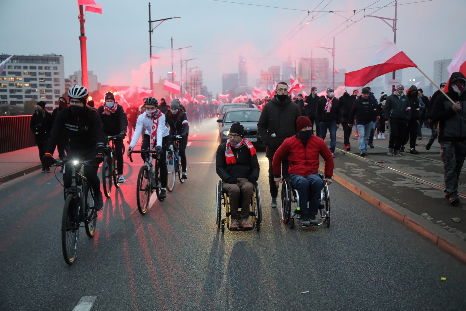W wydarzeniu obok pojazdów brała także udział grupa osób maszerujących z biało-czerwonymi flagami.
