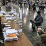 ⬆ Obserwatorzy wyborów obserwują urzędników wyborczych podczas drugiego dnia ponownego liczenia głosów z wyborów prezydenckich w USA (Centrum Wisconsin, Milwaukee). Fot. PAP/EPA/TANNEN MAURY