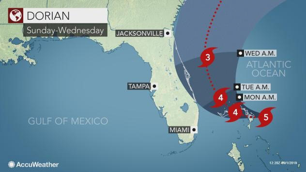 Po przejściu nad Bahamami Dorian prawdopodobnie uderzy we Florydę, aczkolwiek NHC twierdzi, że jego trajektoria w ostatniej chwili może się zmienić i amerykański półwysep może uniknąć głównego uderzenia. Mieszkańcy tego stanu nie mogą być jednak do końca spokojni, gdyż w najlepszym przypadku nad Florydą przejdzie burza tropikalna.