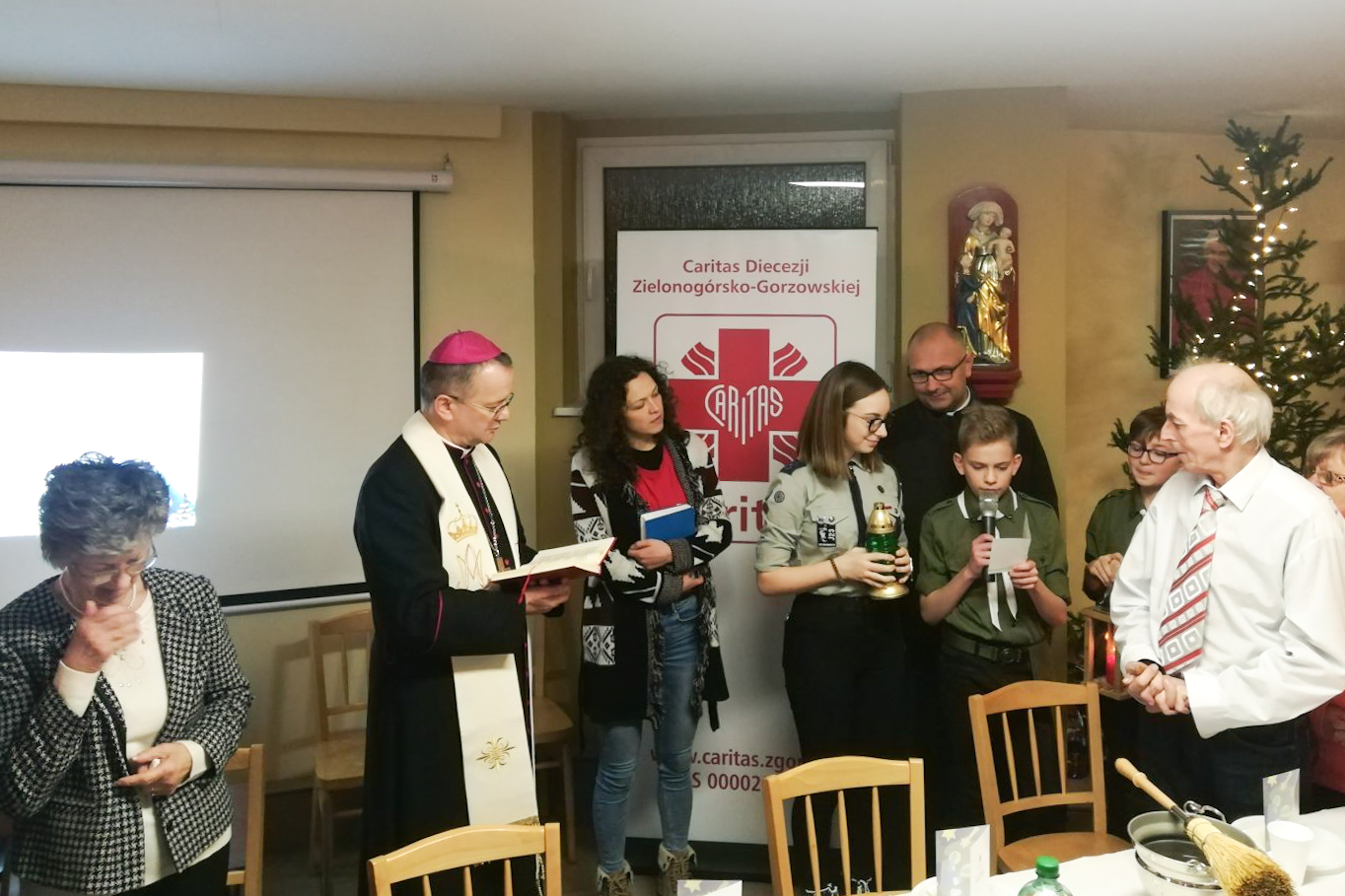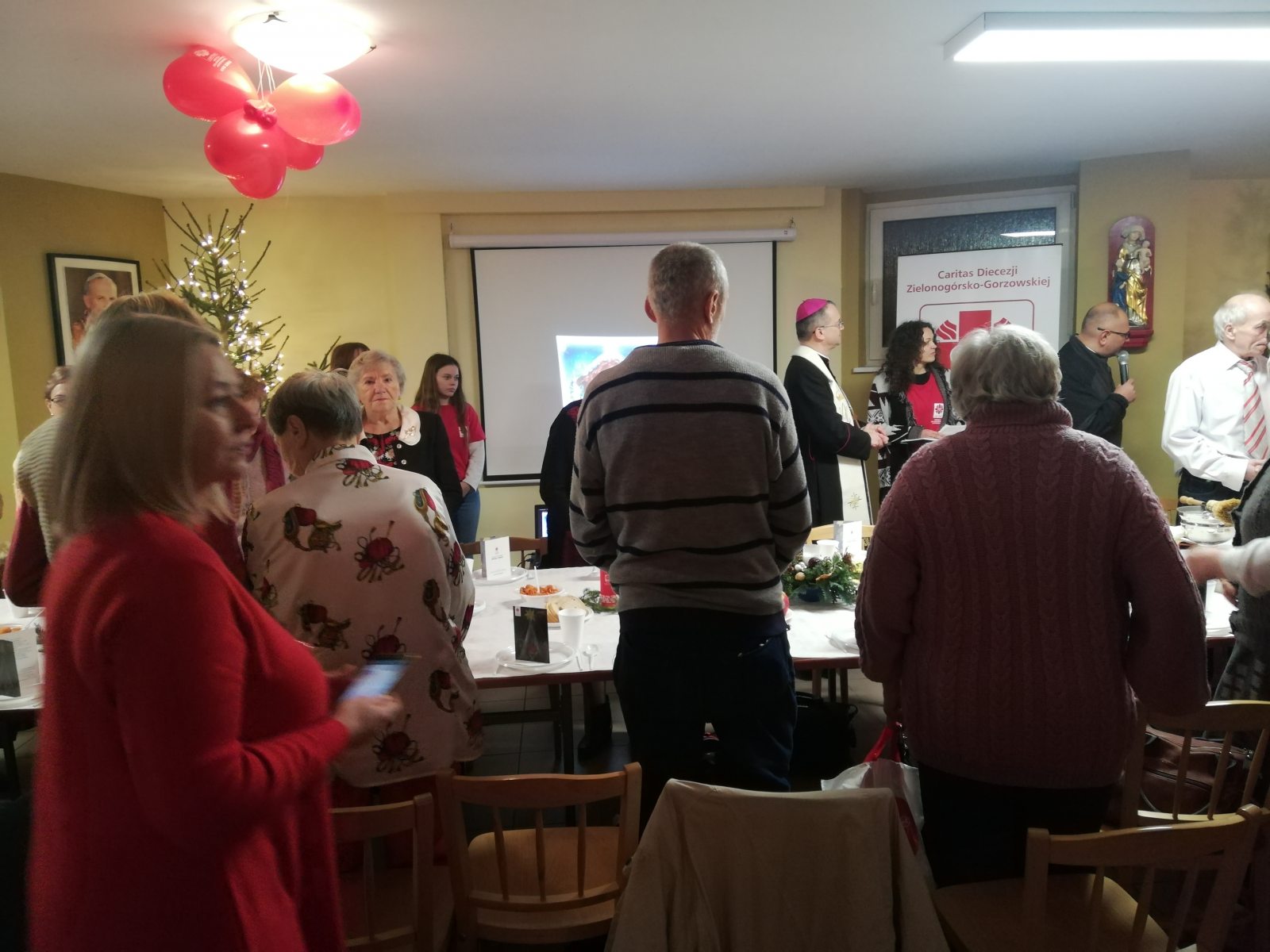 130 osób uczestniczyło w wieczerzy przygotowanej przez wolontariuszy z diecezjalnej Caritas. Były to osoby potrzebujące pomocy, oraz bezdomni. Biskup Tadeusz Lityński rozpoczął uroczystość od błogosławieństwa, następnie łamano się opłatkiem i śpiewano kolędy: