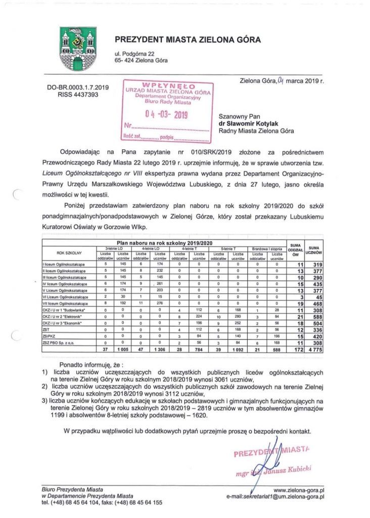 Ta decyzja wywołała chaos. Już 4 marca na pytanie radnego Kotylaka urząd miasta przesłał ilościową listę klas w poszczególnych szkołach. Wynikało z niej, że w Zielonej Górze na uczniów czeka blisko 5000 miejsc:
