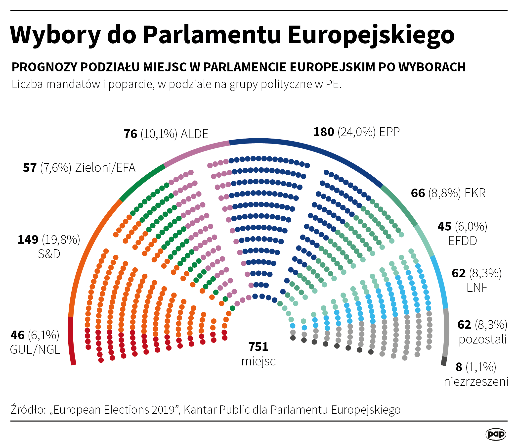 ⬆ 18 kwietnia br. PE opublikował czwarty i ostatni zestaw prognoz podziału miejsc (751) po wyborach do Parlamentu Europejskiego. Oparte są na przekrojowych badaniach krajowych składu parlamentu 9. kadencji z 28 państw UE. Parlament Europejski opublikował nowy zestaw prognoz swojego składu w następnej kadencji przygotowany w oparciu o dane z badań opinii publicznej w 28 krajach opublikowanych do 15 kwietnia 2019. Dane opierają się na selekcji wiarygodnych sondaży przeprowadzonych przez krajowe instytuty badawcze w państwach członkowskich i zebranych na zamówienie Parlamentu przez agencję Kantar Public. Przedstawione tu najnowsze dane opierają się na 43 badaniach ankietowych dotyczących s wyborów do Parlamentu Europejskiego z 21 krajów.(europarl.europa.eu) |