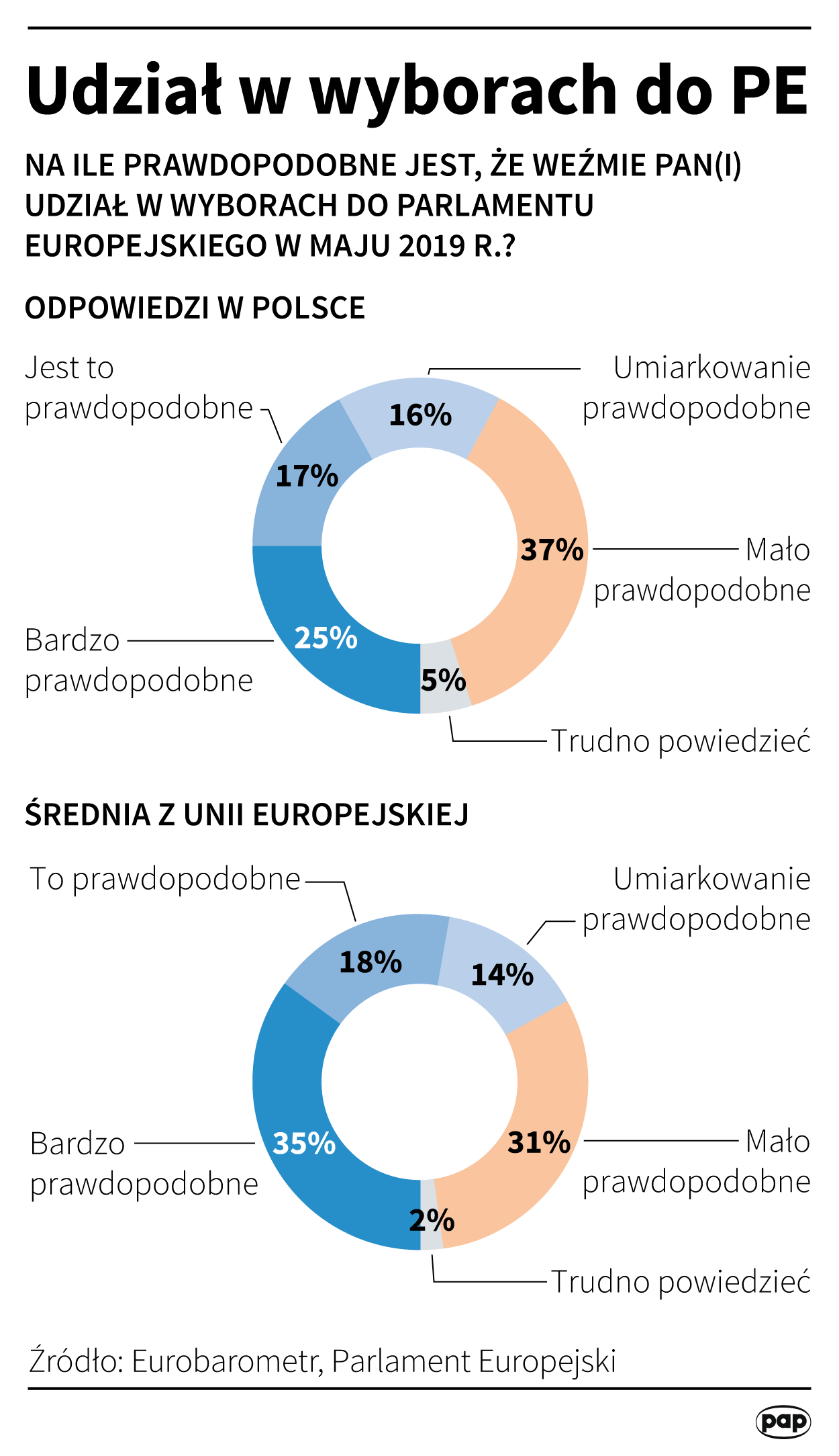 ⬆ Jak przekonuje PE, przyszłość Europy jest teraz w rękach tych, którzy wezmą udział w wyborach europejskich 23-26 maja. Chociaż badanie Eurobarometru wskazuje, że jedna trzecia (35 proc.) obywateli Unii jest przekonana do wzięcia udziału w głosowaniu, to niewiele mniej (32 proc.) wciąż nie znalazło argumentów za pójściem do lokali wyborczych. |