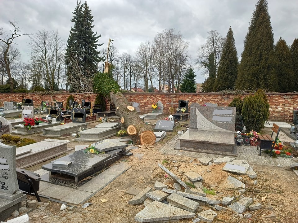 W Lubuskiem wciąż niebezpiecznie. Silny wiatr nadal wyrządza wiele szkód. Na największym żagańskim cmentarzu powalone przez wichurę drzewa zniszczyły wiele nagrobków.