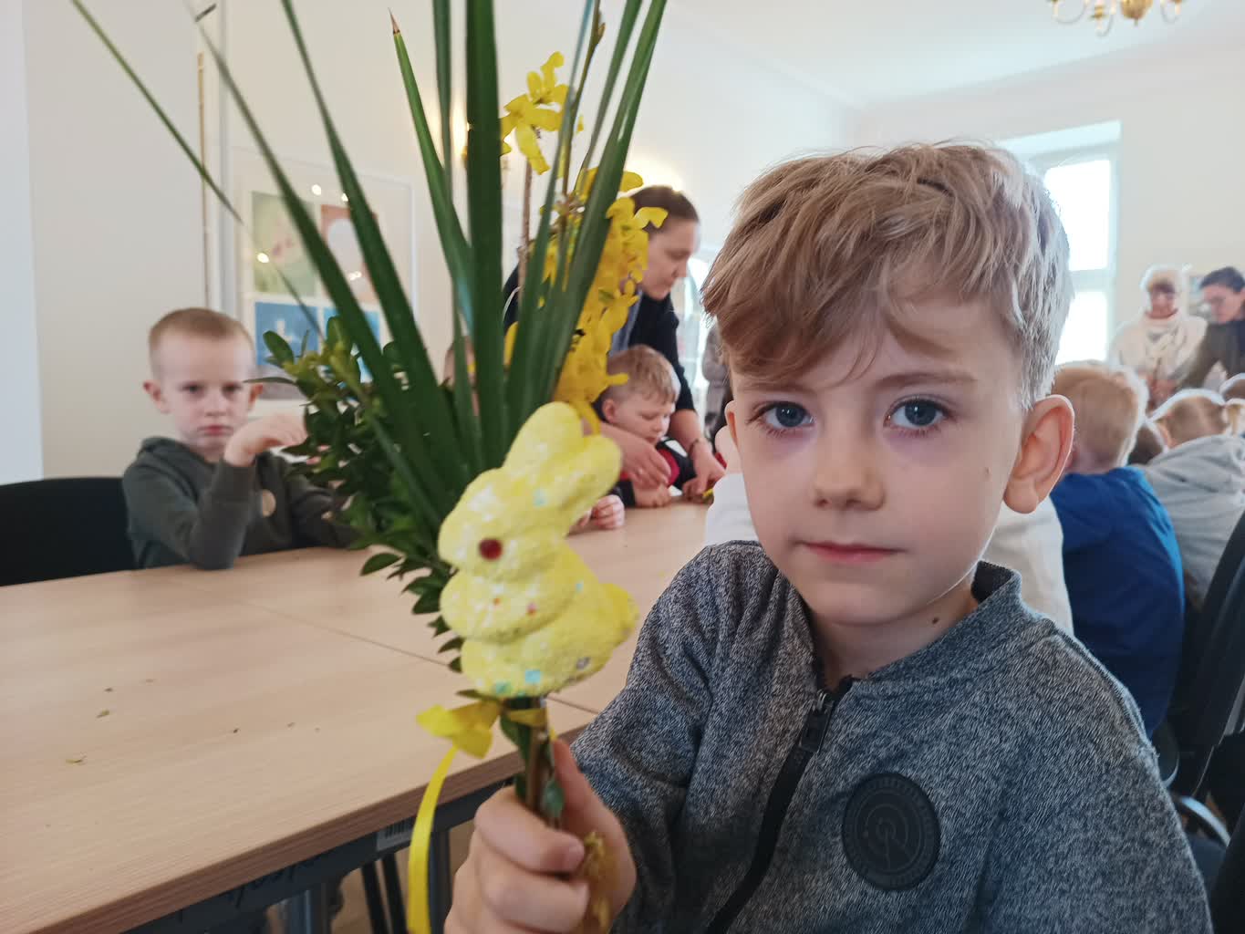 Jak mówi podopieczny żagańskiego przedszkola Mieszko, żeby zrobić palmę trzeba wcześniej nazbierać gałązek i kwiatów: