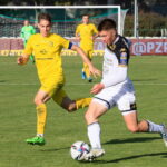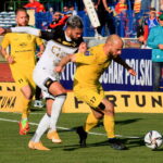 Zielona Góra, 12.10.2022. Zawodnik Lechii Zielona Góra Wojciech Fabisiak (L) i Martin Pospisil (P) z Jagiellonii Bia³ystok podczas meczu 1/16 pi³karskiego fina³u Pucharu Polski, 12 bm. (js) PAP/Lech Muszyñski