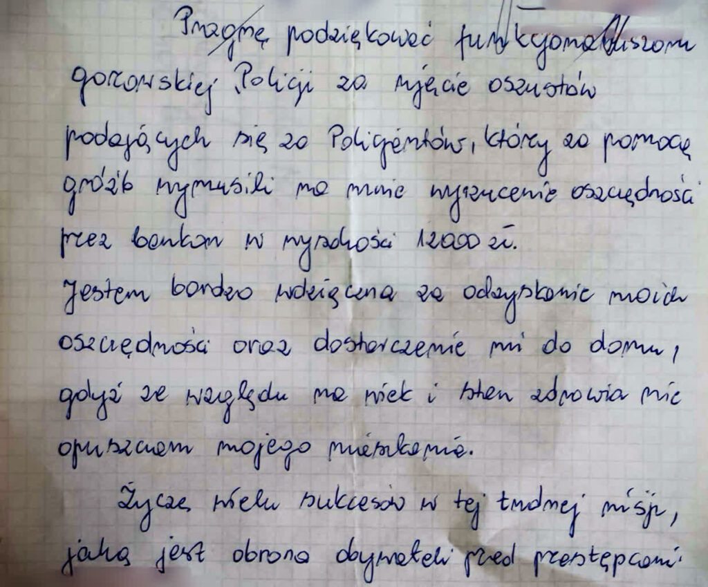 Miejscy policjanci wkrótce zatrzymali oszusta. Tuż przed świętami do gorzowskich policjantów dotarł list od pokrzywdzonej, w którym dziękowała za sprawne działanie. Mundurowi mają nadzieję, że z tego zdarzenia każdy wyciągnie odpowiednie wnioski, a seniorzy słysząc w słuchawce informacje o rzekomej akcji policjantów, zakończą takie połączenie zanim dojdzie do oszustwa.