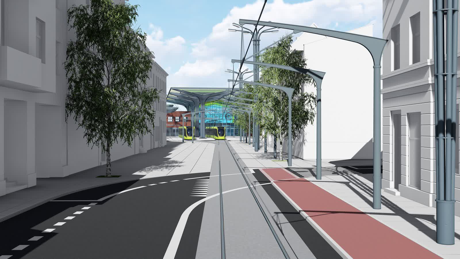 Plac przed dworcem PKP zostanie zagospodarowany na nowo. Torowisko tramwajowe zostanie wyprowadzone łukiem w stronę estakady. Na placu przed dworcem PKP pojawi się nowa zieleń, zostaną nasadzone drzewa, powstaną nowe trawniki. Postawione zostaną ławki dla oczekujących na tramwaj. Wybudowane też będą miejsca postojowe dla taxi, parkingi kiss&ride