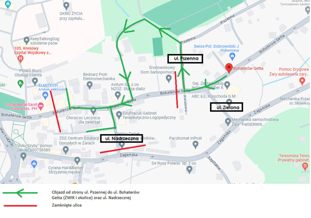 W związku z przebudową drogi ul. Bohaterów Getta w Żarach znów nastąpiła zmiana organizacji ruchu. Ponieważ ulica jest dość długa i ma wiele skrzyżowań, a znajduje się przy niej wiele instytucji i firm, drogowcy remontują ulicę odcinkami, zamykając je sukcesywnie.