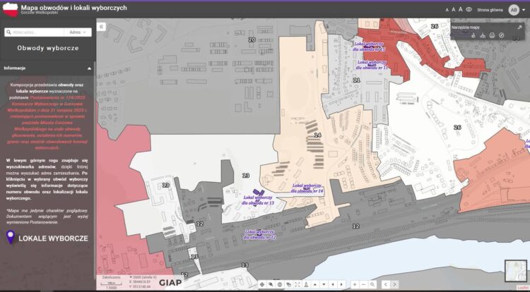 Mapa z oznaczeniem lokali wyborczych na miejskim geoportalu