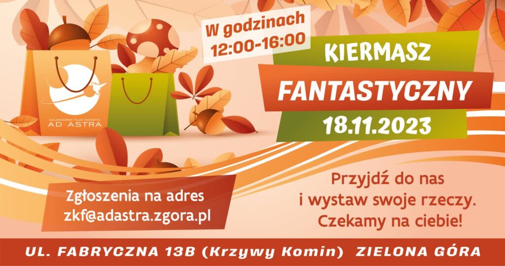 Kiermasz odbędzie się w godzinach od 12 do 16, wstęp wolny. Organizatorem kiermaszu jest Zielonogórski Klub Fantastyki Ad Astra.