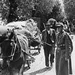 Kolumna ukraińskich wysiedleńców konwojowana przez wojsko w drodze do punktu zbornego, fot.