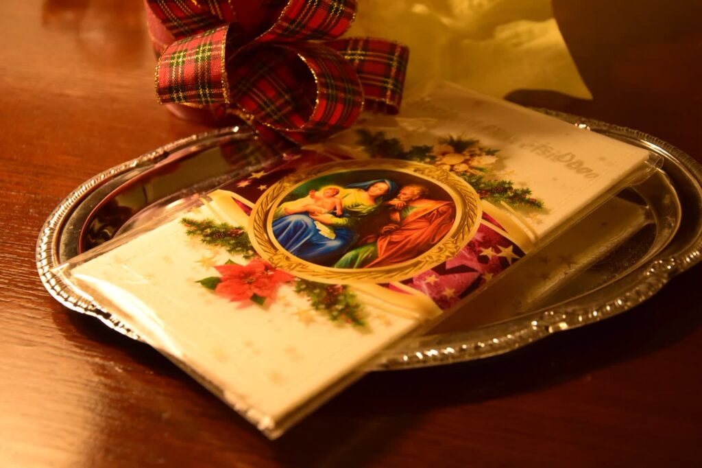 Według tradycji, na stole powinno się znaleźć 12 potraw, ale to liczba umowna w zależności od regionu. W niektórych obowiązkowa była nieparzysta liczba dań. Początek kolacji wigilijnej to łamanie się opłatkiem: