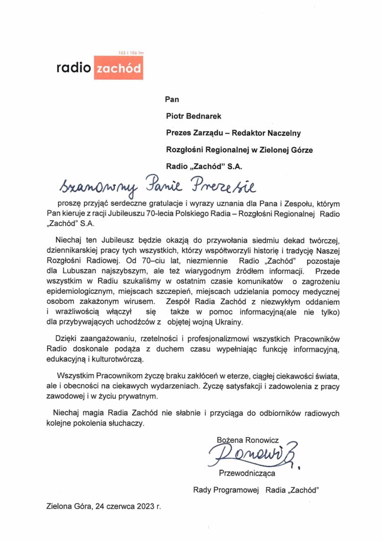 List-Bożena-Ronowicz-70-lat-Radia-Zachód