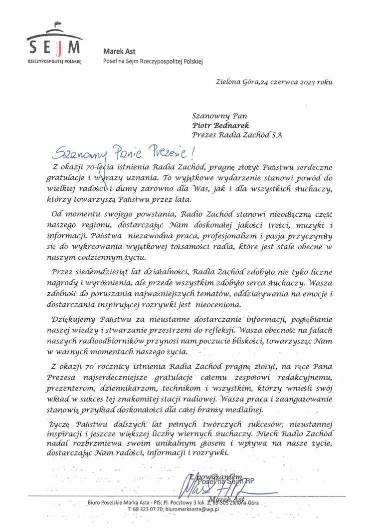 List-Marek-Ast-70-lat-Radia-Zachód