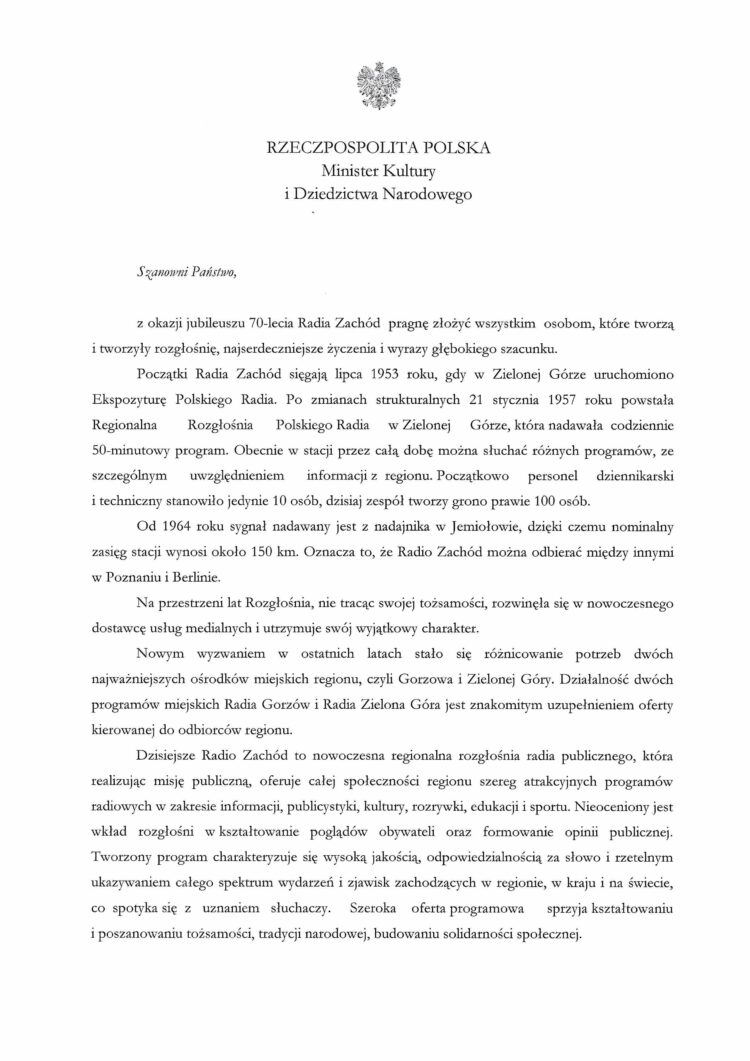 List-szef-MKiDN-70-lat-Radia-Zachód